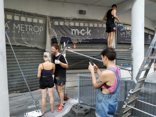 Be under no illusions, this was somewhat collaborative to no end. I was involved in every single dimension of this project along the way; from fund-raising, to cleaning the site, to organising everyone on site and of course every level of the art work; from sketches for our proposal to the City of Paris to selecting colours & co-ordinating with various paint suppliers; as well as liasing with Street Society and the public as to which colours were in agreement with the local community. As late as just a week before beginning the project Centre Pompidou selling works on the street together with the help of Martin, my acting studio manager, and Katja, who was carrying out her internship with my studio and joined us for the Paris adventure for some 4 weeks. It was often far from glamorous and it was really the hearts - and of course hard working hands - of people that pulled this project over the finish line. The first stage was about cleaning the site. I was there, together with Martin & Katja and Alice Poncheaux and Lucile from the Street Society team along with others who came and went scrubbing the site. The City of Paris were late to appear to the site but after some tugging on the bureaucratic side of things they did, long last appear with power jet-washes and more effective cleaning equipment than we had started out with. Then came the marking out the primary pattern. I drew out all the lines and not far behind me friends, volunteers and people from both my studio and Street Society began painting and taping away. I was always there on site. I encouraged people how to paint but of course never exactly pushed on anyone forcibly! Even when tired I didn't become a Gordon Ramsay-like character. The mood was so often buouyant, joyful and intensively energetic. Day after day after day after day we toiled away. Once we had reached around half-way - that is painting all of the first layer of colours and marking out the pattern so people could continue painting the colours - I started drawing. After receiving an enormous order of permanent markers and equipment from Molotow we were set. Micah, who also made a lot of the documentation seen in this section, was there refilling pens and changing the tips. I simply danced around the site endlessly; sometimes mounting the crane to get up high and draw upside down; other times taking the pillars at eye height and moving through with a professional precision; the likes of which I had never exercised before. Some sections I came to use my opposite hand; particularly in sections where shorter lines were necessary. No sketches were made on to the background of painted colours. The buildings were drawn spontaneously and though I had visual aids, the mural grew entirely organically. I had a list of buildings to include; I knew about the stories of these buildings and had heard some of the audio too! Though most is in fact in French. The pictures speak largely for themselves but I wanted to again take this opportunity to thank everyone for their hardwork; the process was endless and people chipped in from all around the world; a list of the names who participated in the project I honoured writing on a spray-painted silver grid on the mural! It was a spectacular achievement for everyone involved, not least for those whom submitted their stories for the world to hear! Merci beaucoup!